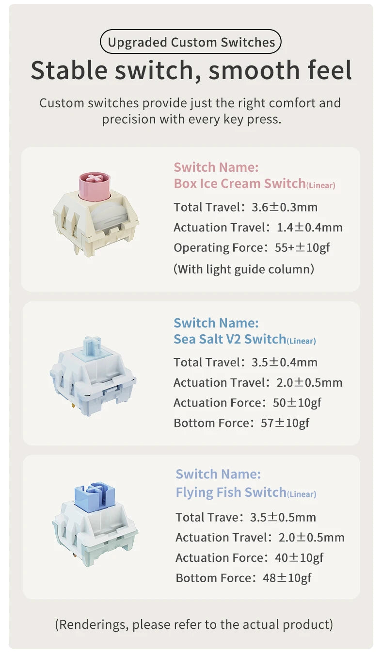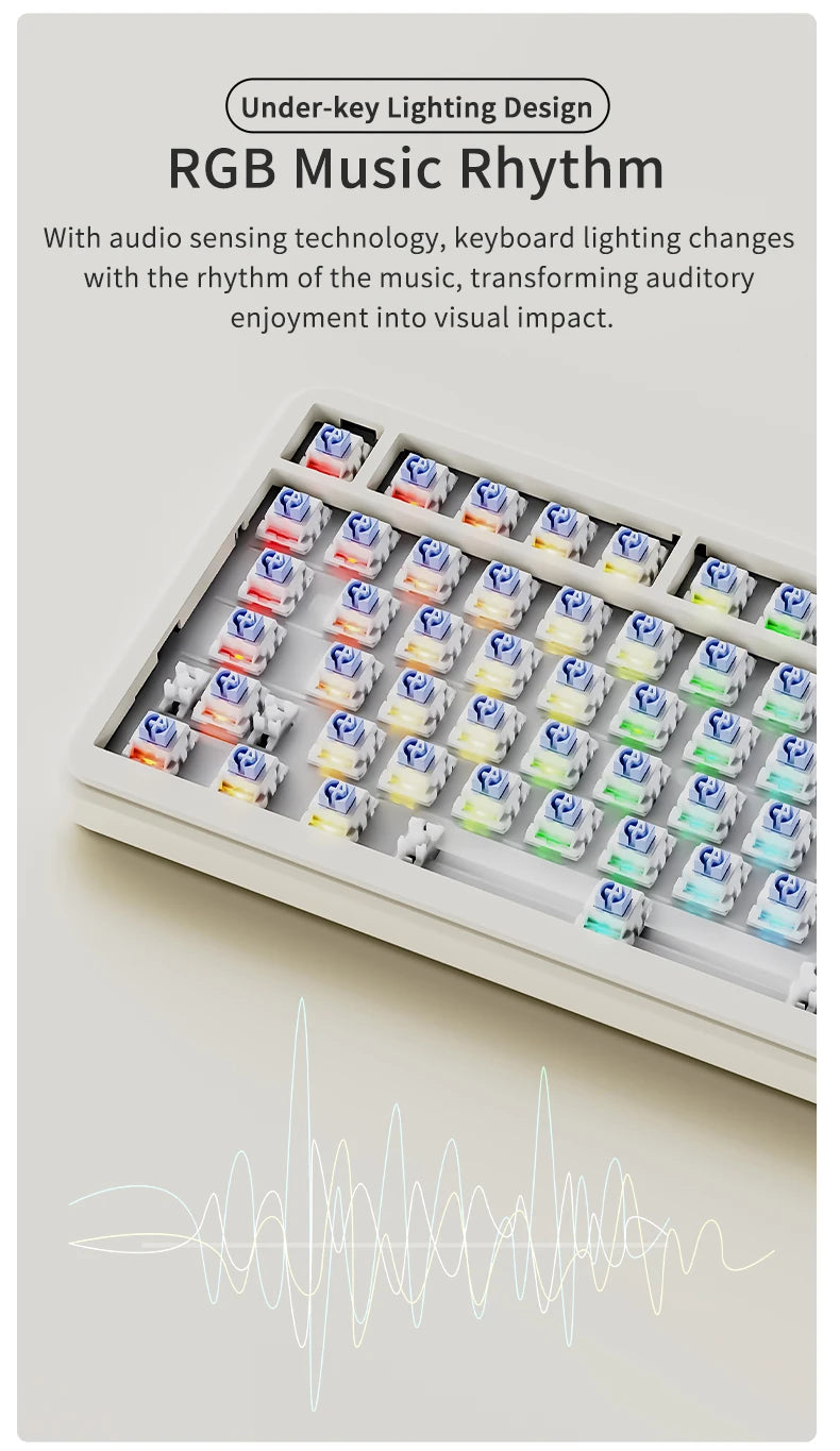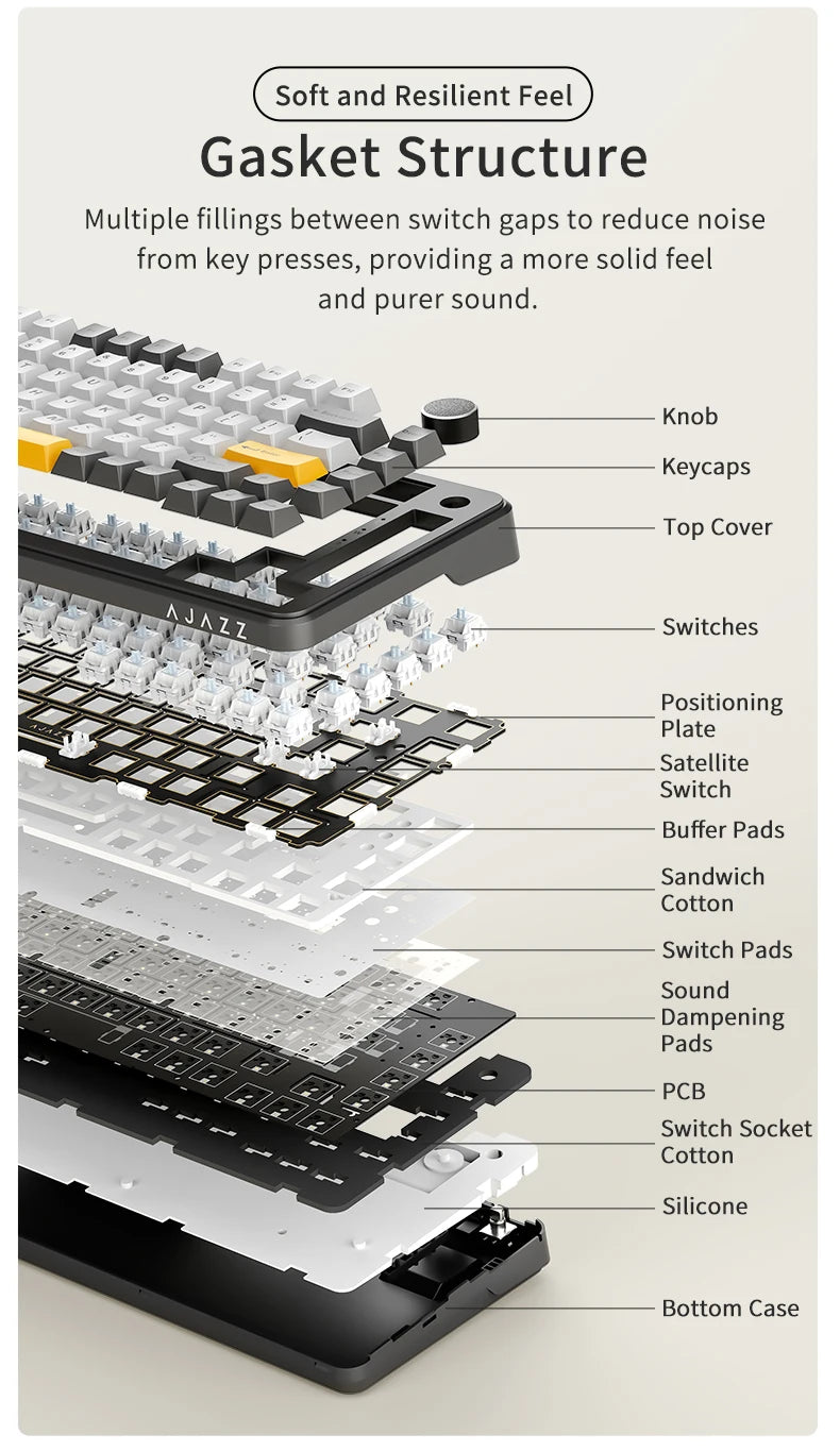 Estructura Gasket Mount Premium: Equipado con múltiples capas de absorción de sonido, incluyendo espuma IXPE y almohadillas de silicona, que eliminan ruidos metálicos y ofrecen una sensación de tecleo flexible y satisfactoria.