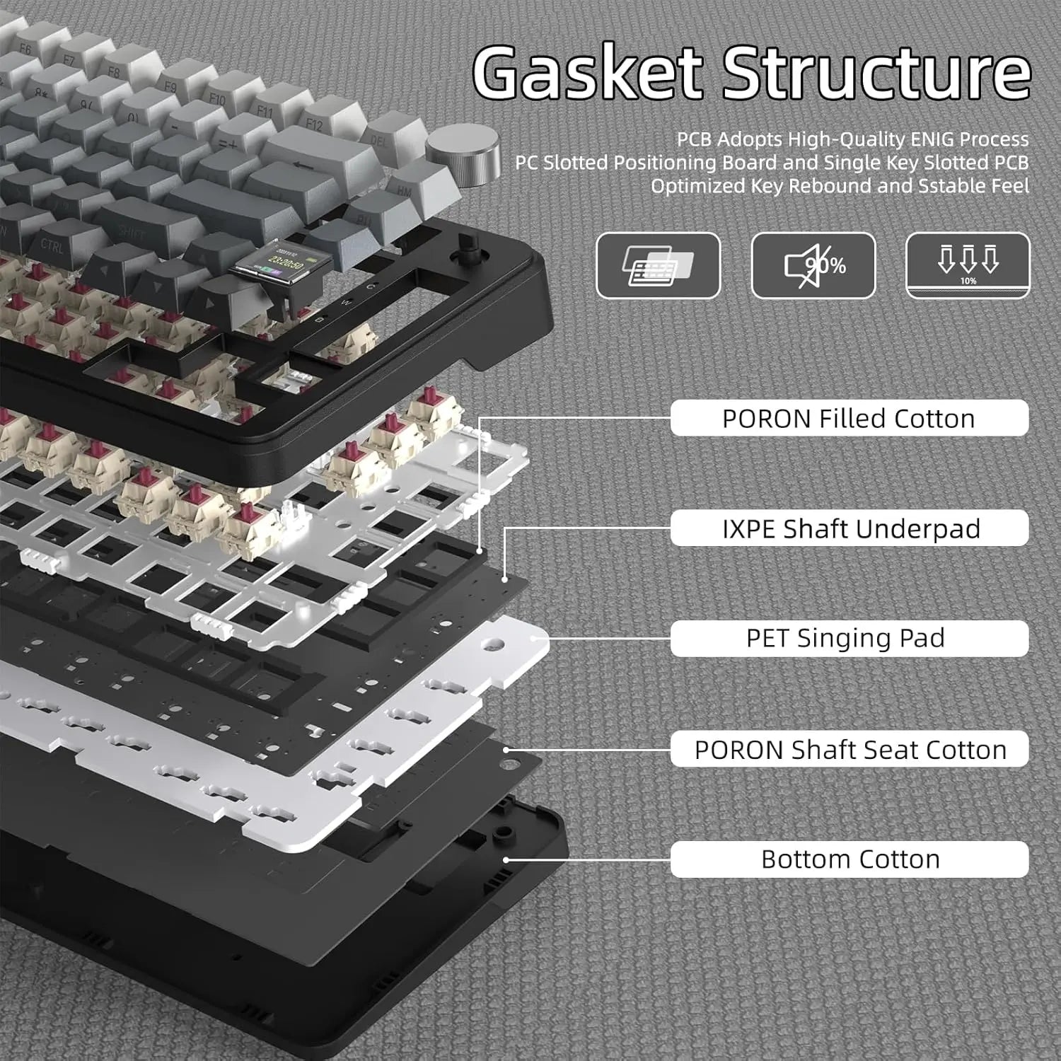 Estructura Gasket Mount Premium: Olvídate del ruido metálico. Sus múltiples capas de espuma absorbente y placa flexible garantizan un sonido "thocky" y una experiencia de escritura que reduce la fatiga.